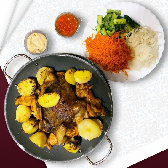Шашлык из шейки свинины,шашлык из филе окорочков,шашлык из куриной грудки,шашлык из корейки свинины, уши свиные на углях.Гарнир: морковь острая,картофель на гриле,огурцы свежие,лук маринованный. Соус : соус