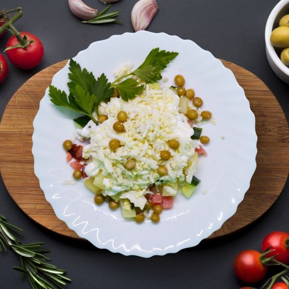 Кета х/к,свежий огурец,картофель отв.,яйцр,горошек,майонез