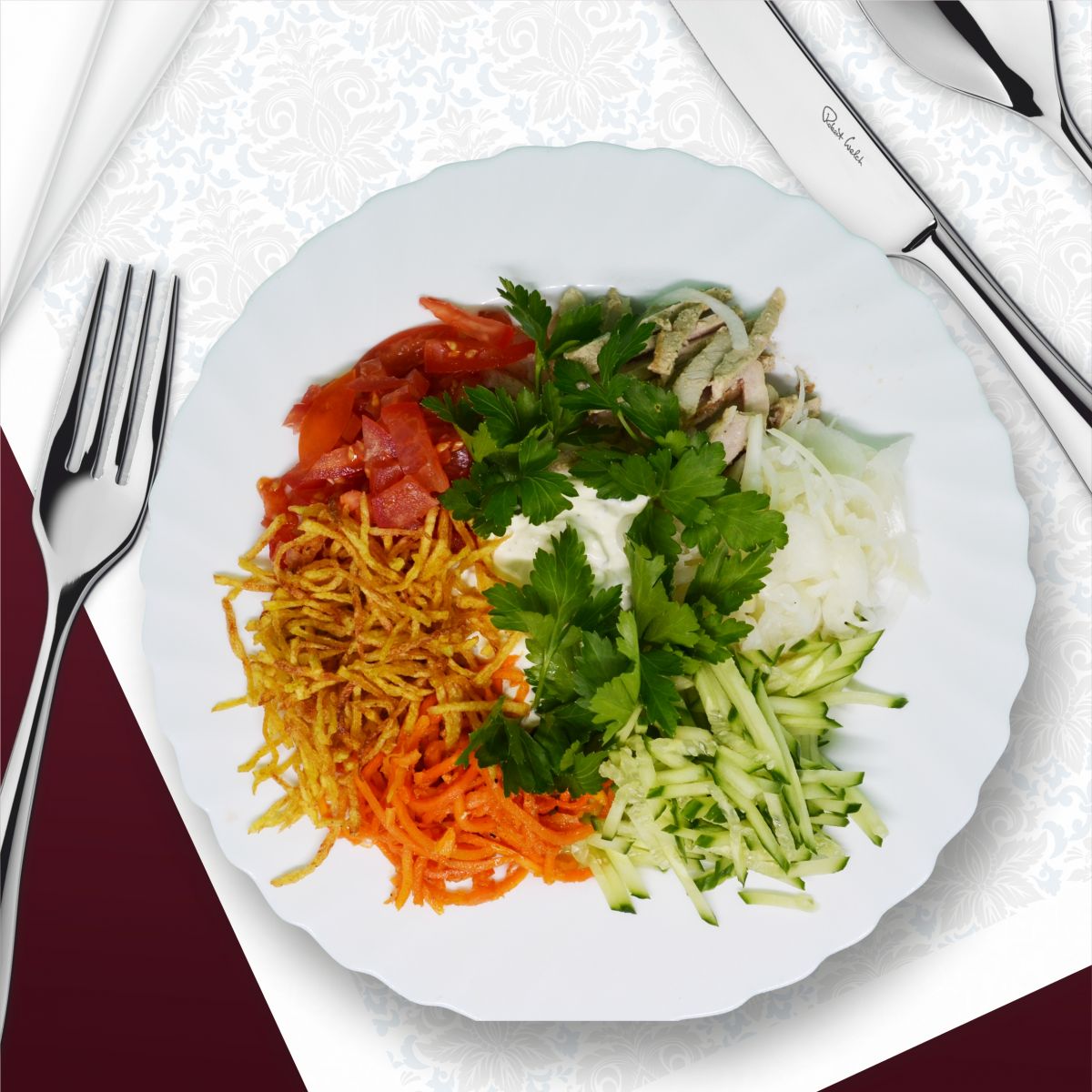 Отварная Телятина,карбонат,помидоры, огурцы,лук,острая морковь,картофель