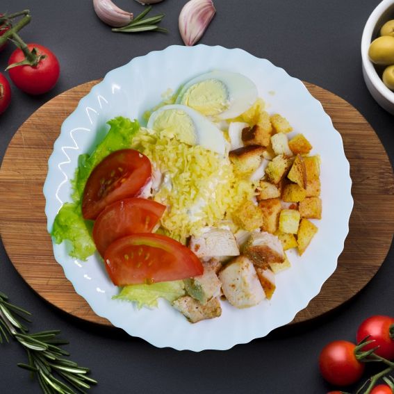 Филе кур жар, капуста пекинская, помидоры, сыр, яйцо, сухарики, соус «Цезарь»